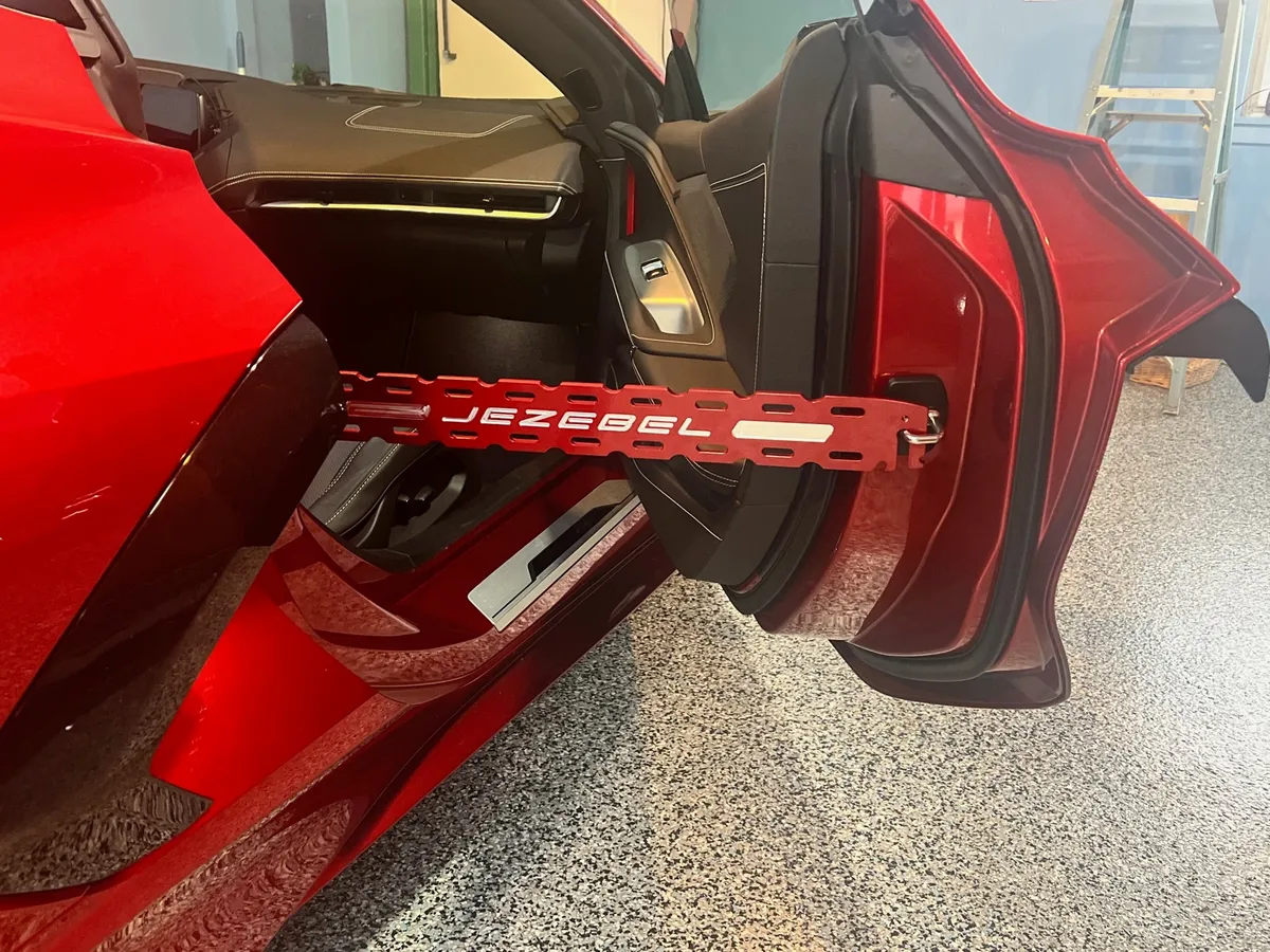These door props fit C8 2020-2024 all models. This part comes in a custom automotive paint with whatever name you want creating a shiny machined look in the letters like the pictures. The perfect upgrade to make you car stand out from the rest. My door props once installed will not lift of off door stricker. The stricker peg on the body side is made to resemble the actual pin. If you would like you cn order a trunk propin the same color. Others have a universal screw for it. Made in USA from Billet 6061-T6 materiaL. Letters can not be any other color.